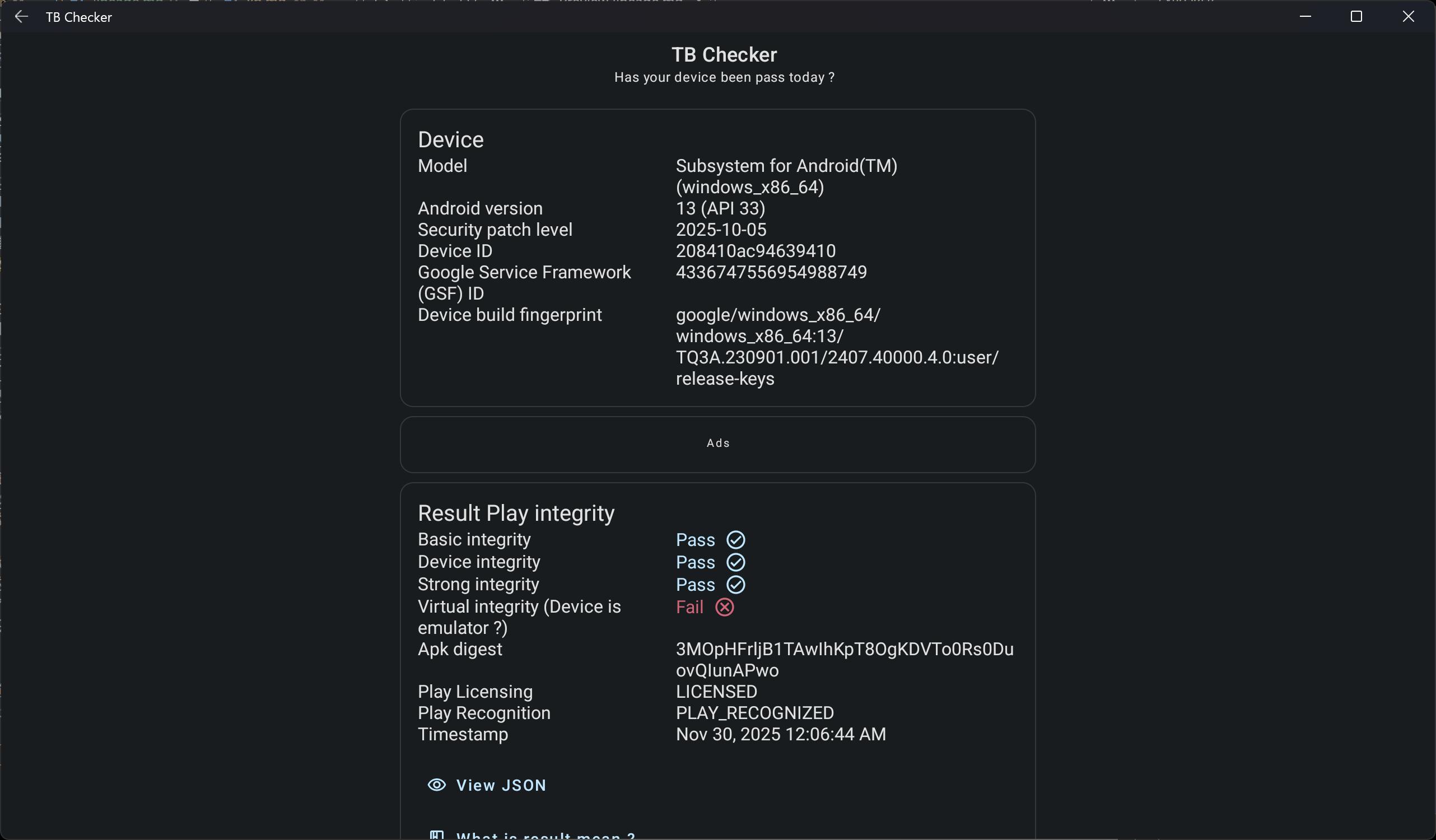 For information on how to pass Google's Play Integrity/SafetyNet certification, the current solution can be found in this GitHub repository. Due to time constraints, I chose to use WSA with Magisk pre-installed for verification.