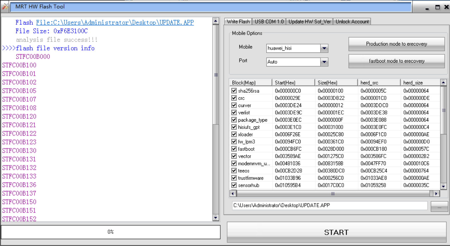Our goal now is to unpack these two zip files. Each zip file contains a file named UPDATE.APP. We'll first load the UPDATE.APP file from the larger zip file into the Write Flash section of the Hunter Huawei Standalone Cracked Version. You'll usually get the following result: